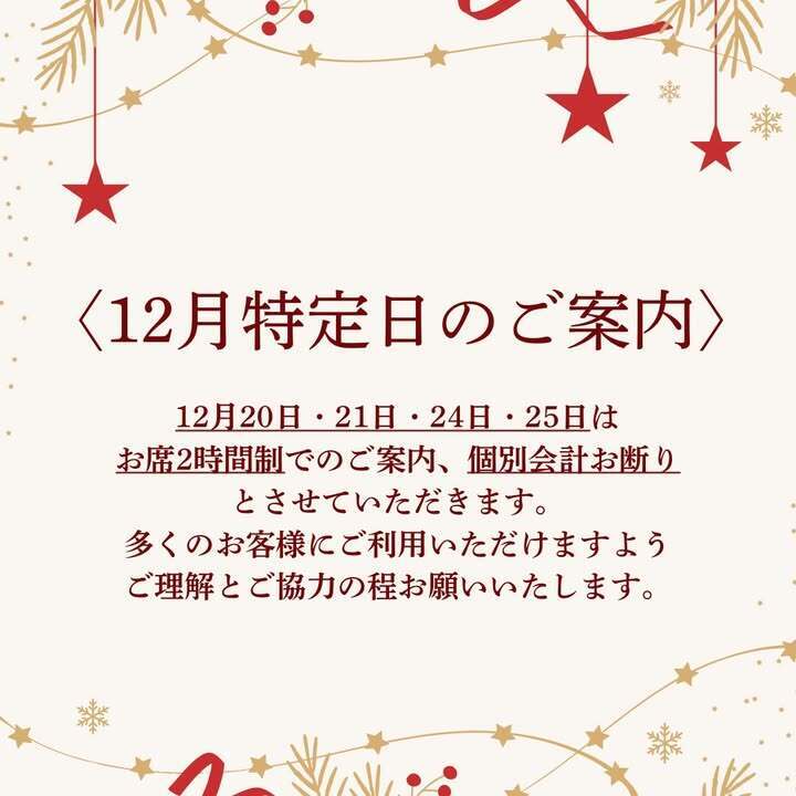 12月20日・21日・24日・25日はお席2時間制、個別会計お断りでのご案内とさせていただきます。